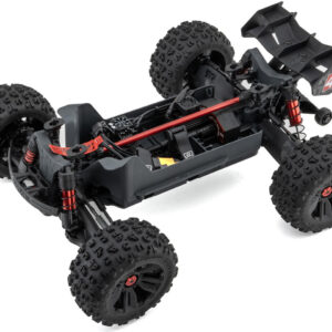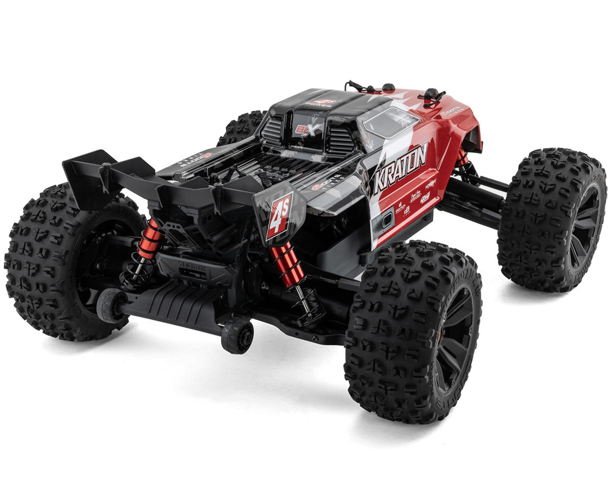 With oil-filled aluminum shocks, adjustable turnbuckles, adjustable ride height, and a wheelie bar with rubber tires, the Kraton 4S BLX is well-equipped for a thrilling R/C monster truck experience. The tough black multi-spoke wheels and CNC-machined, red anodized 17mm wheel hubs add to its rugged aesthetics. The multi-terrain dBoots Copperhead 2 LP vented low-profile tires, combined with the adjustable body mounts and front bumper with protective skid plates, complete the package. As a fully ready-to-run truck with a 2-year limited warranty, the Arrma Kraton 4S BLX is undoubtedly a must-have for enthusiasts seeking the next level of bashing, performance, and speed in an R/C monster truck.